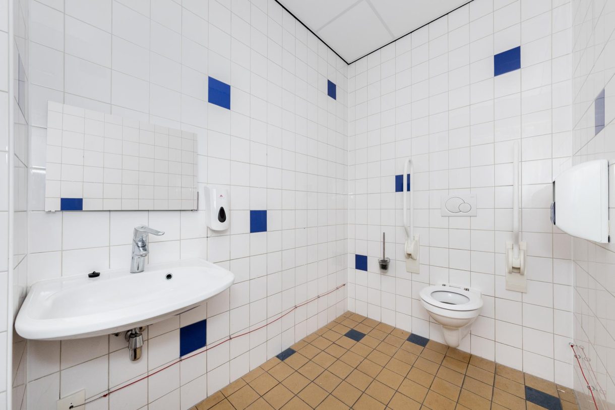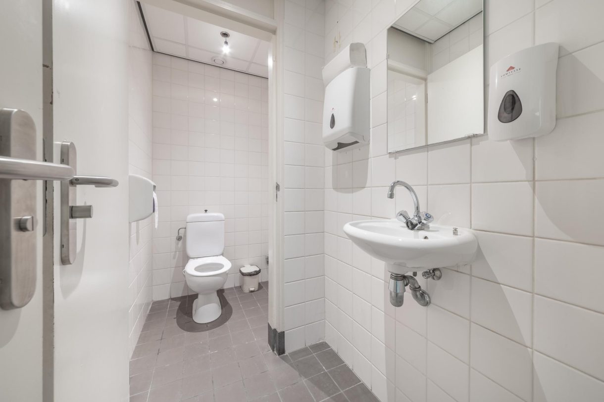 De facilitaire ruimte is, net als de toiletgroep, vanuit de kantoorruimte te bereiken. Er zijn twee toiletgroepen en een separaat invalidentoilet.