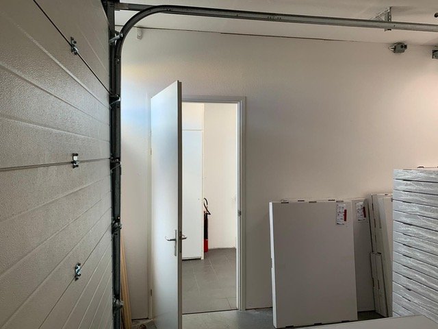 Bedrijfsruimte met overheaddeur en voorzien van TL verlichting.