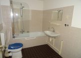 Overloop, 3 slaapkamers, badkamer met bad, toilet, wastafel en wasmachine-aansluiting.