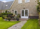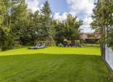 De tuin is uitstekend onderhouden, met glooiende grasvelden, diverse perken, appel- en pruimenbomen en is gelegen achter een klein bosperceel. De voortuin beschikt over drie vlaggenmasten en het gehele terrein is omheind met sloten en een toegangspoort, wat zorgt voor optimale privacy en veiligheid.