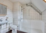 Overloop met toegang tot drie slaapkamers, waarvan één met toegang tot een balkon. De badkamer is voorzien van een douche, toilet, wastafel en spiegelkast.