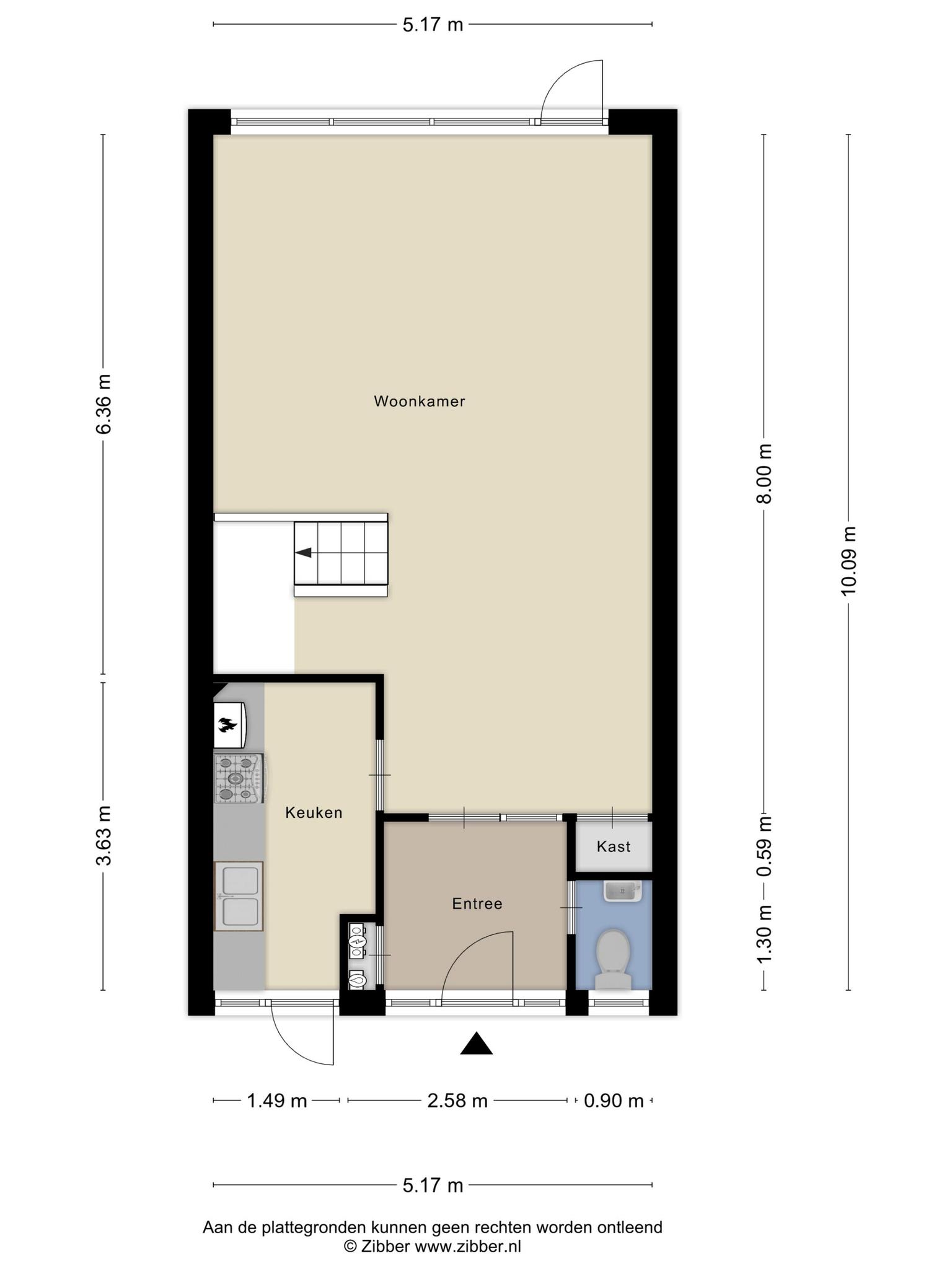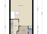 Hal, standaard betegeld toilet met standaard sanitair, meterkast met glasvezelaansluiting , brede tuingerichte woonkamer met deur naar de tuin en open trap in de woonkamer, dichte keuken (technisch afgeschreven en toe aan vervanging).