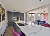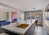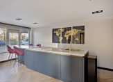 U betreedt de woning via de entree met meterkast en toiletruimte (zwevend toilet en fonteintje). De royale tuingerichte woonkamer is dankzij de voormalige garage vergroot tot een riante leefruimte. Hier geniet u van veel licht en comfort. De moderne inbouwkeuken (11-2022) met kookeiland is een echte eyecatcher en van alle gemakken voorzien: