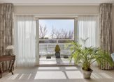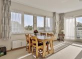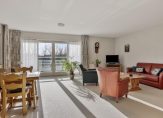 Ruime woonkamer: Dankzij de hoekligging valt er een overvloed aan natuurlijk licht naar binnen. De schuifdeuren verbinden de woonkamer met het grote balkon, waar u heerlijk kunt ontspannen in de zon.